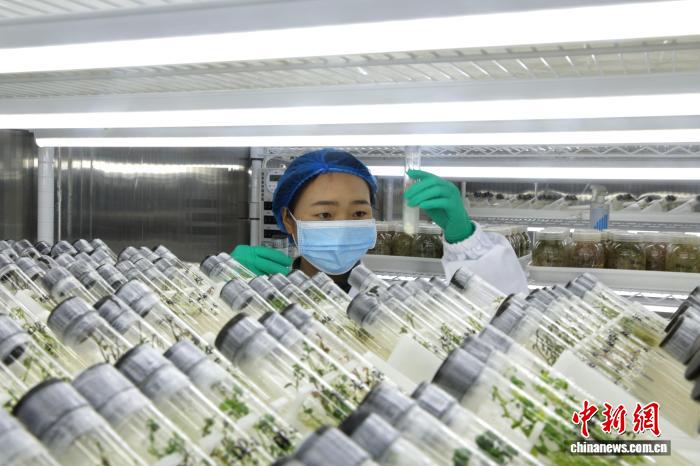 今日青海年夜教农林迷信院死物技能研讨所,任务职员正正在土豆基果库整饬组培苗。中新社记者 弛忠苹 摄