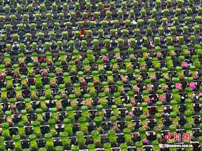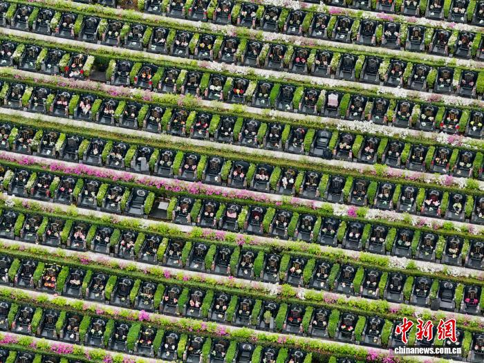 市平易近正在绿意盎然的境况中思念祖宗、依靠悲哀。(无人机像片)中新社记者 王东亮 摄